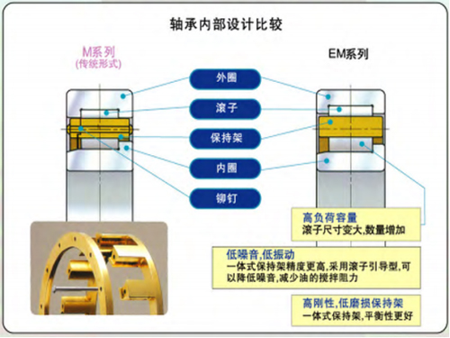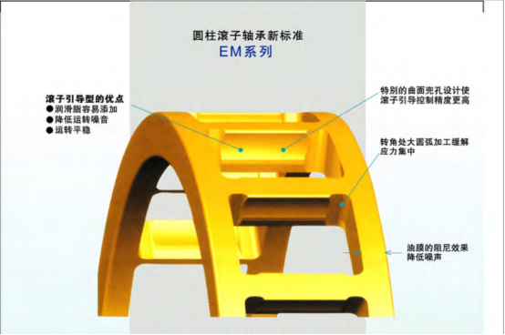 skf原先提供的以下两种单列skf圆柱滚子轴承的标准保持架,标准车削保持架型套圈引导型分离式铜合金保持架)高负荷容量E型(套圈引导型-体式铜合金保持架)。现在,skf开发了21世纪的铜合金一体式保持架的圆柱滚子轴承。EM系列轴承兼具以上两种轴承的优点,并进一步提高了性能。skf基于新的设计理念而开发的全新构造轴承。无论在性能还是寿命上,都具有较强的特性,是新时代的高负荷容量圆柱滚子轴承。